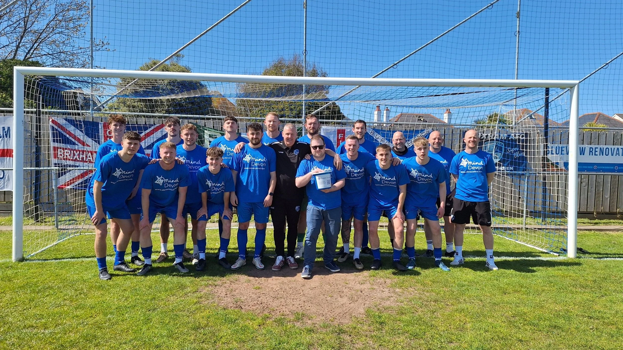Devon Mind Marketing & Fundraising Manager Andre Sexton with the Brixham AFC squad, coaches, and club chairman Phil Thomas